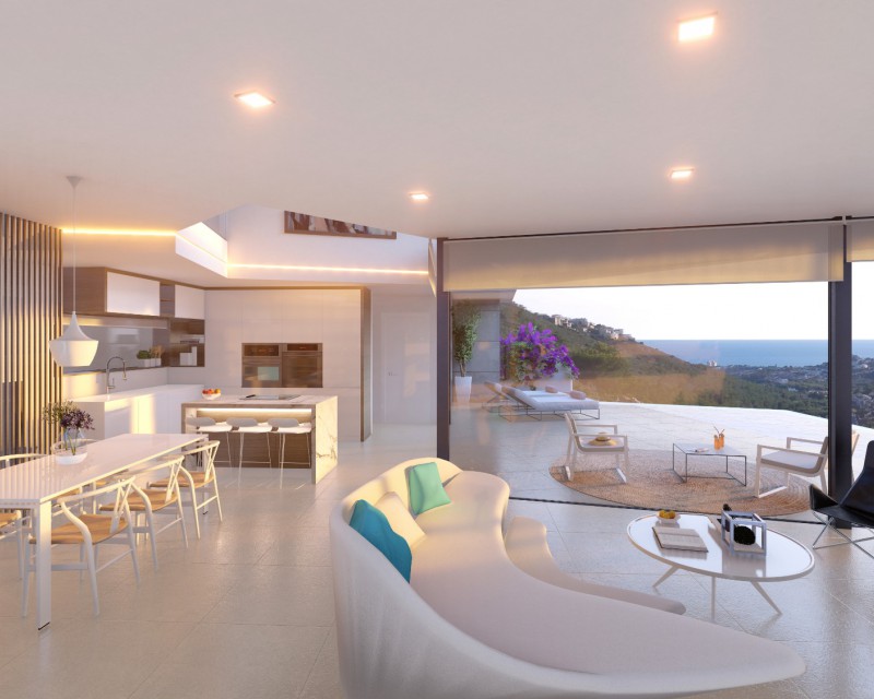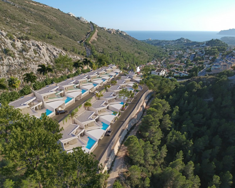 Villa de diseño moderno actualmente en construcción. Ubicada en el valle de El Portet, esta villa contemporánea de tres dormitorios cuenta con una orientación suroeste y ofrece vistas panorámicas al mar hacia el Peñón de Ifach. Se puede llegar a centros comerciales, playas y al centro de la ciudad de Moraira en 5 – A 10 minutos en coche. Los precios oscilan entre 770.000 y 825.000 euros, dependiendo de la posición dentro de la promoción y del tamaño del edificio. Planta baja (superficie útil 119,51 m2): Porche de entrada cubierto Recepción, comedor y cocina diáfanos Lavadero Terraza cubierta junto a la piscina Aseo Doble Dormitorio con vestidor y baño en suite. Primera Planta (superficie útil 74,44 m2): Pasillo galería Dos dormitorios dobles con baño en suite y vestidor. Ambos dormitorios tienen acceso a un amplio balcón terraza. Planta Baja: A Plaza de garaje con una superficie útil de 41,73 m2. Desde el garaje se accede a la zona de estar principal mediante escalera interior. Calidades incluyen: Pavimento porcelánico cerámico de alta calidad cortado a máquina de 90 x 90. Carpintería exterior de aluminio anodizado color gris grafito con rotura de puente térmico y doble cristal, con persianas motorizadas en los dormitorios. Cocina totalmente amueblada con puertas laminadas en blanco, acabado lacado mate, apertura mediante push y cajones con freno. Incluye placa de inducción, horno y campana extractora.Todos los baños y aseo están acabados con azulejos, muebles bajo lavabo, espejos, sanitarios de porcelana y columnas de ducha con control termostático.Armarios con puertas lacadas en blanco, barras para colgar, estanterías y elección entre un zapatero, cajones o rieles para colgar adicionales. Sistema de audio multisala con servidor de música en el sótano. Las zonas de audio estarán en salón, cocina, dormitorio principal y terraza de la piscina. La calefacción por suelo radiante se alimenta mediante bomba de calor de aerotermia, combinada con paneles fotovoltaicos. Aire acondicionado por conductos con bomba de calor, regulando cada estancia de forma independiente. TV y red Conexiones en salón y dormitorios. Mandos domóticos para persianas de dormitorios y puerta de garaje. La preinstalación para carga del coche es opcional.
