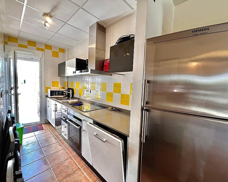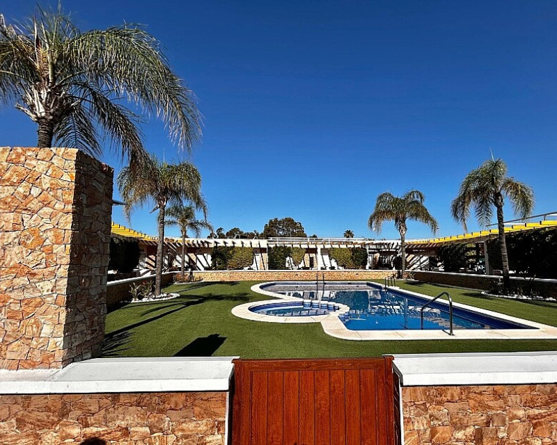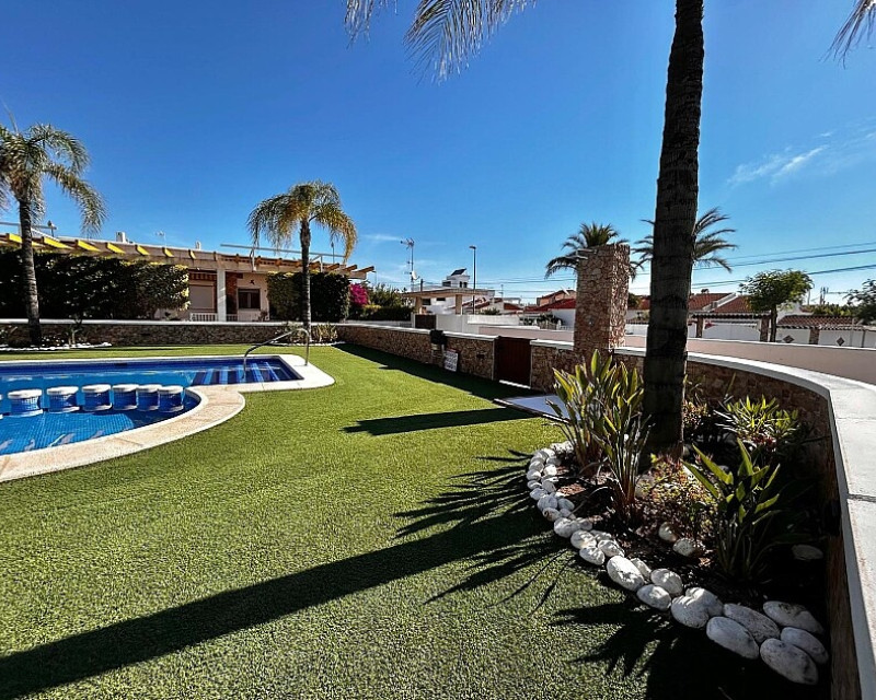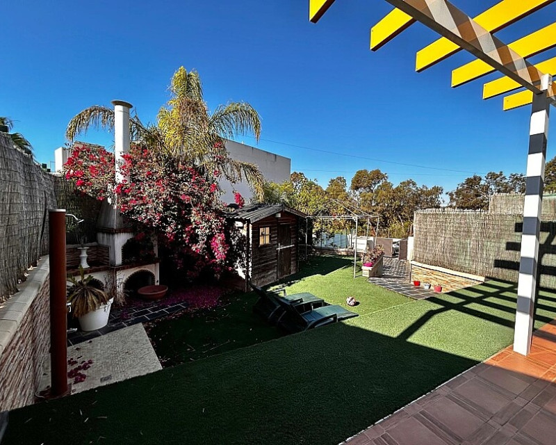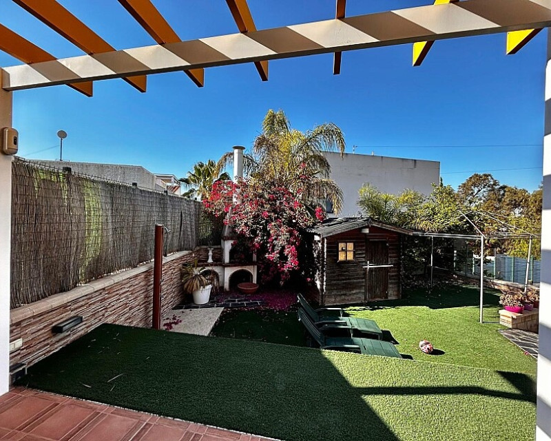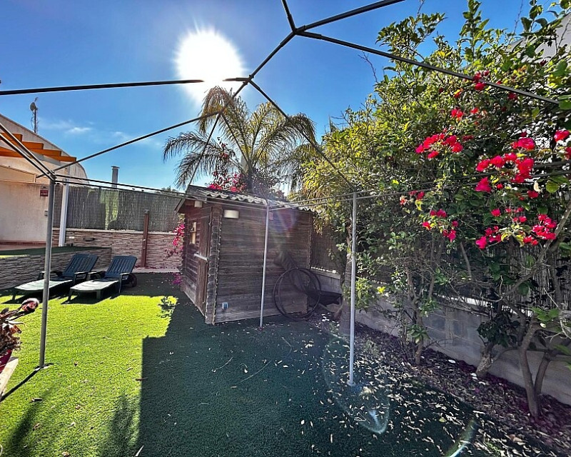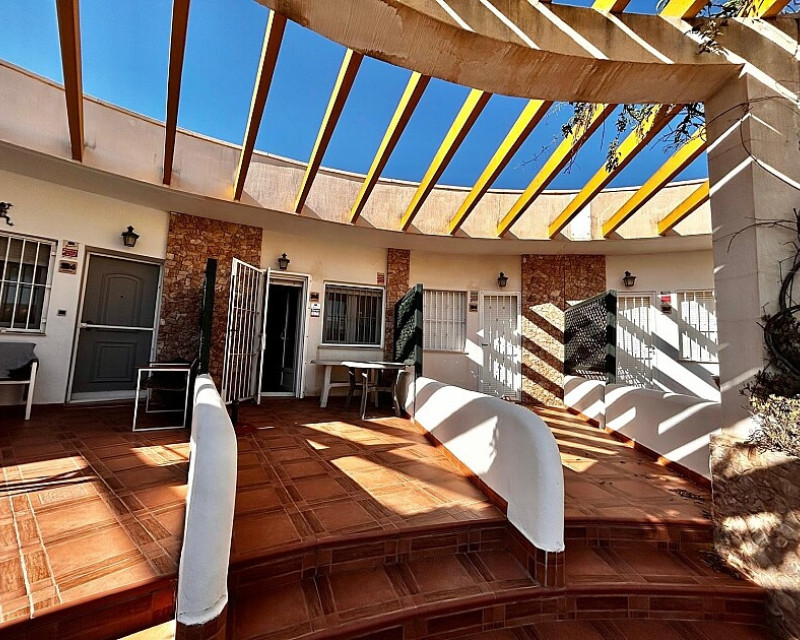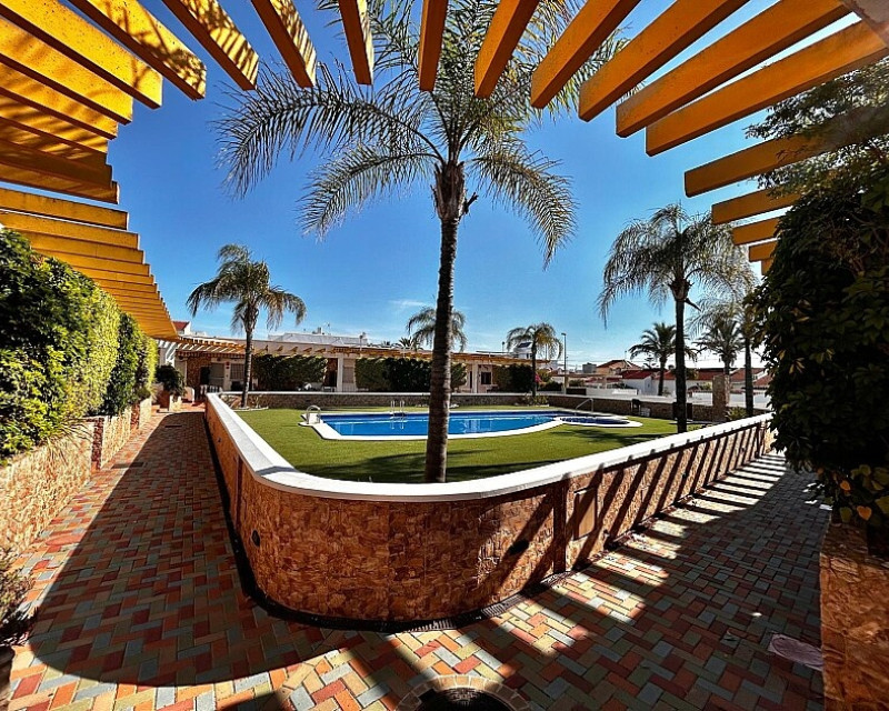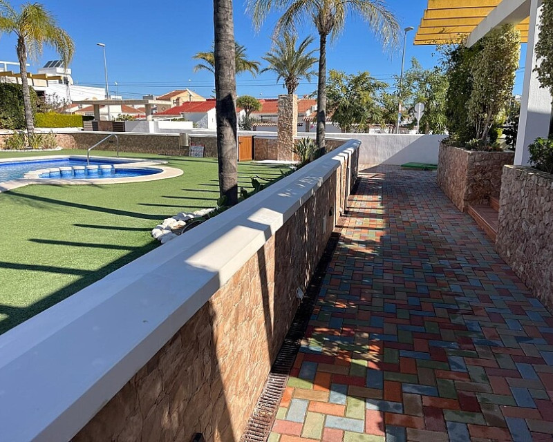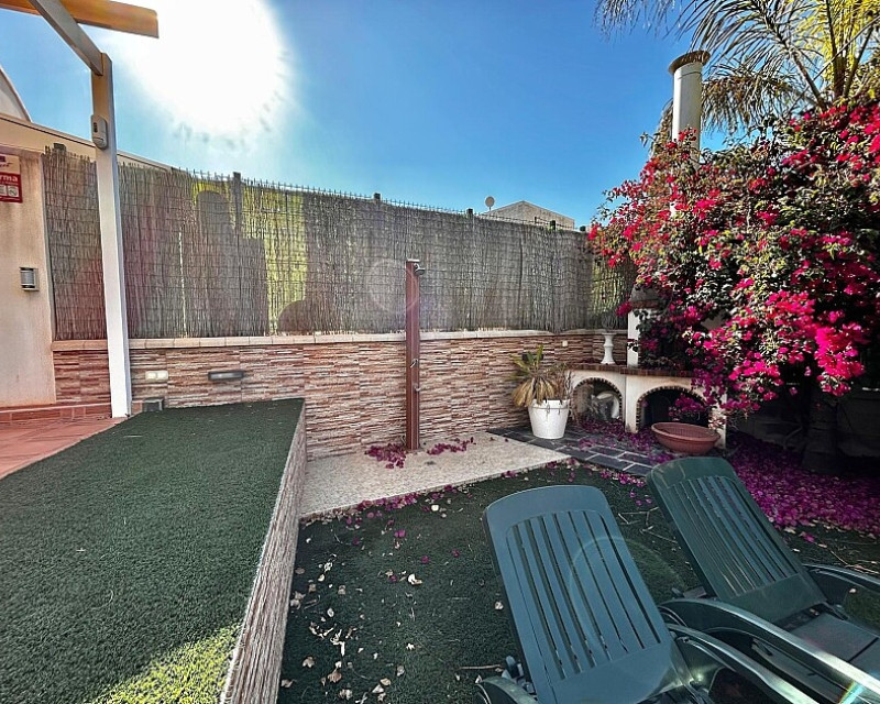 Adosado en planta baja de 2 dormitorios en Mil Palmeras . Adosado de 2 dormitorios en planta baja con orientacion sur en Mil Palmeras La vivienda tiene salón-comedor, cocina independiente, 2 dormitorios y 1 baño con ducha. Dispone además de una terraza de 21 m2 y un jardín de 60 m2 con zona de barbacoa. La vivienda tiene piscina comunitaria, zonas ajardinadas y parking comunitario. Disfruta de muy buena ubicación y cercanía a las playas de Mil Palmeras y Campoamor. A poca distancia hay todos los servicios necesarios, a 5 kilómetros del centro comercial La Zenia Boulevard.