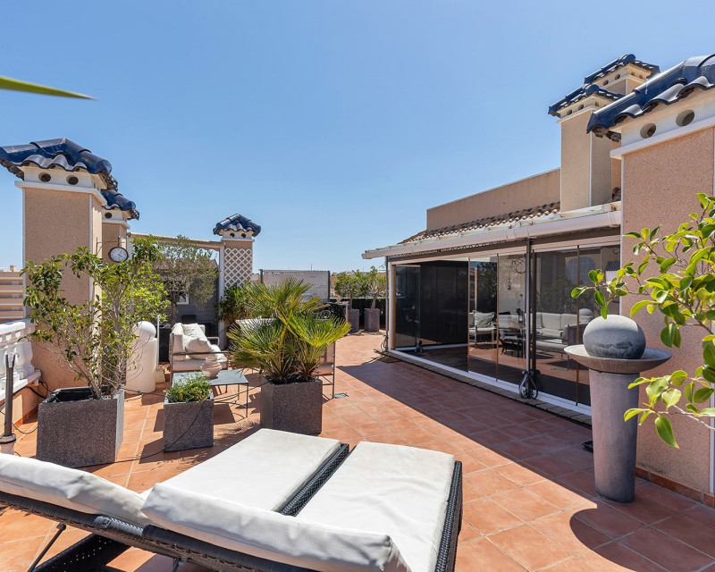 Descubra este ático con acabados de primera calidad en una cuidada residencia en Villamartín, a solo tres kilómetros de la playa. Este apartamento listo para entrar a vivir cuenta con dos cómodos dormitorios y dos amplios cuartos de baño, todos ellos situados en una sola planta para un confort óptimo. El interior está decorado con buen gusto y acabado con atención al detalle. La luminosa sala de estar y la cocina moderna y muy funcional se integran a la perfección con el amplio porche y la gran terraza privada, donde podrá disfrutar del clima mediterráneo en paz y tranquilidad. La vivienda cuenta con un garaje subterráneo cerrado y una plaza de aparcamiento adicional, ambos incluidos en el precio. Además, la residencia dispone de una piscina comunitaria interior y exterior, para que pueda disfrutar del agua y el relax durante todo el año. Una propiedad ideal para quienes buscan comodidad, estilo y una excelente ubicación cerca de la playa, el golf y los servicios.