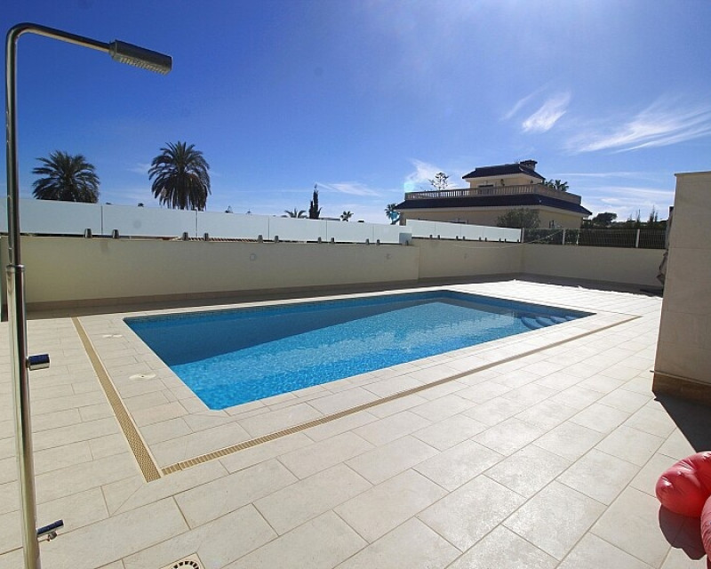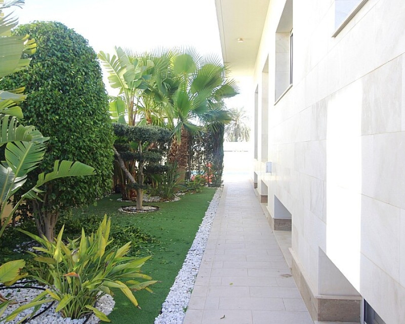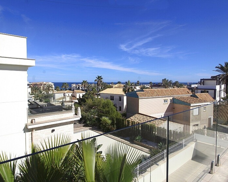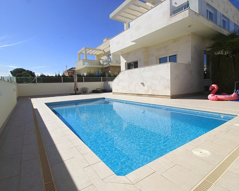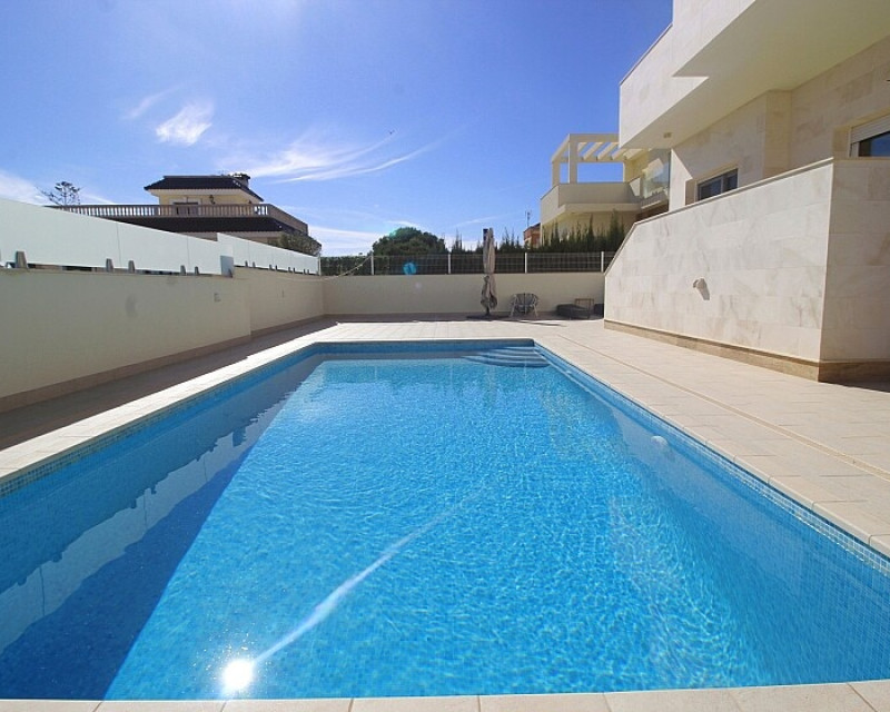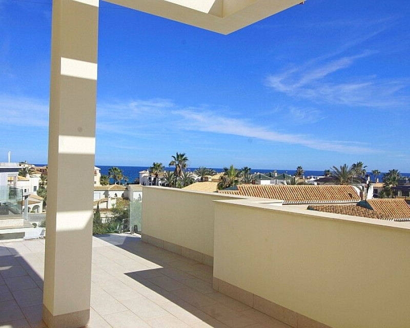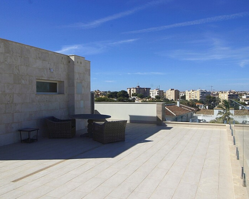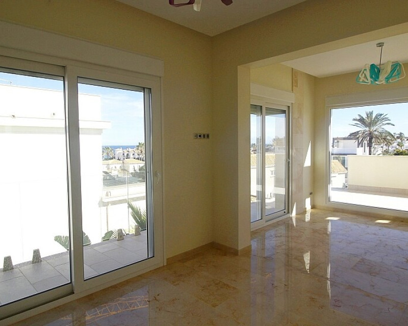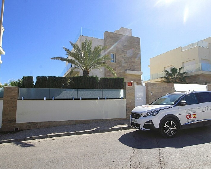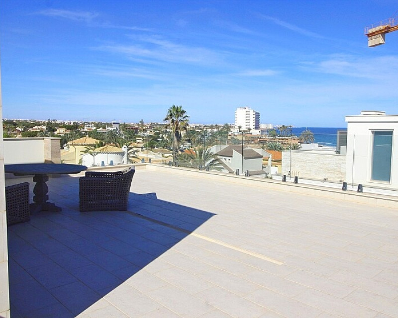 Detached 5-bedroom villa with sea views in La Zenia. Splendid luxury villa a few meters from the beach of La Zenia. This chalet has 3 floors with 5 bedrooms and 4 bathrooms, an open kitchen with a large living room and underfloor heating throughout the house. It is a modern and elegant building with a private pool and garden, an underground garage and a solarium with panoramic sea views. The house is a few meters from La Zenia beach, very close on foot to restaurants, cafes and bars, public transport and other services. 15 minutes walk to the La Zenia Boulevard shopping center, 10-15 minutes by car to several golf courses and the city of Torrevieja.
