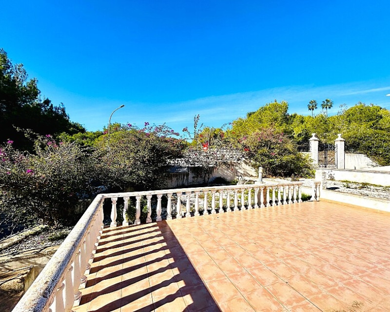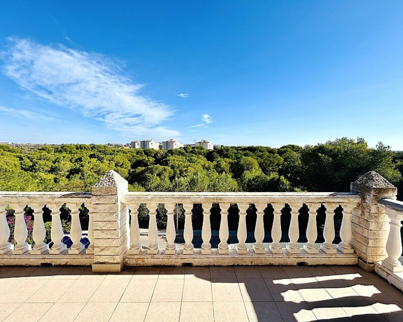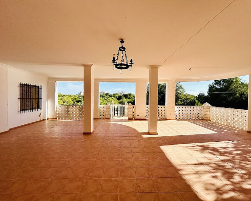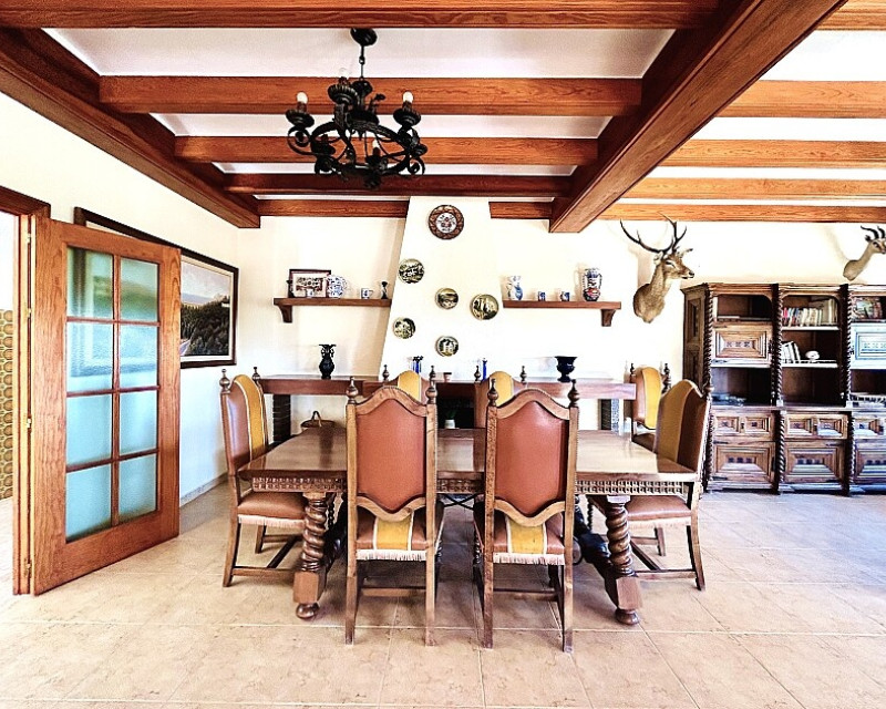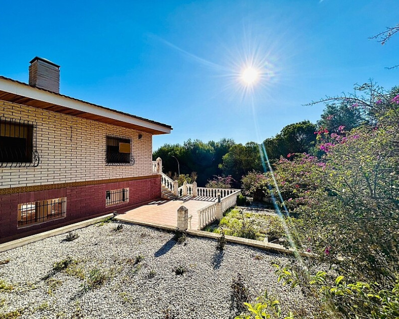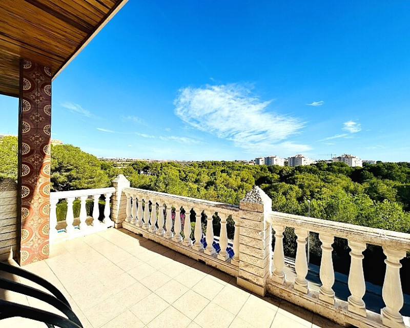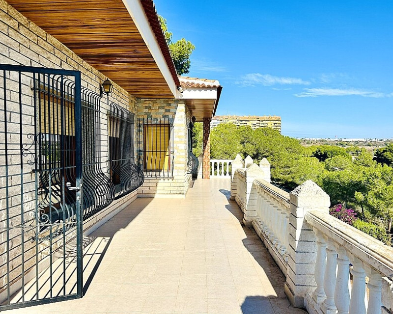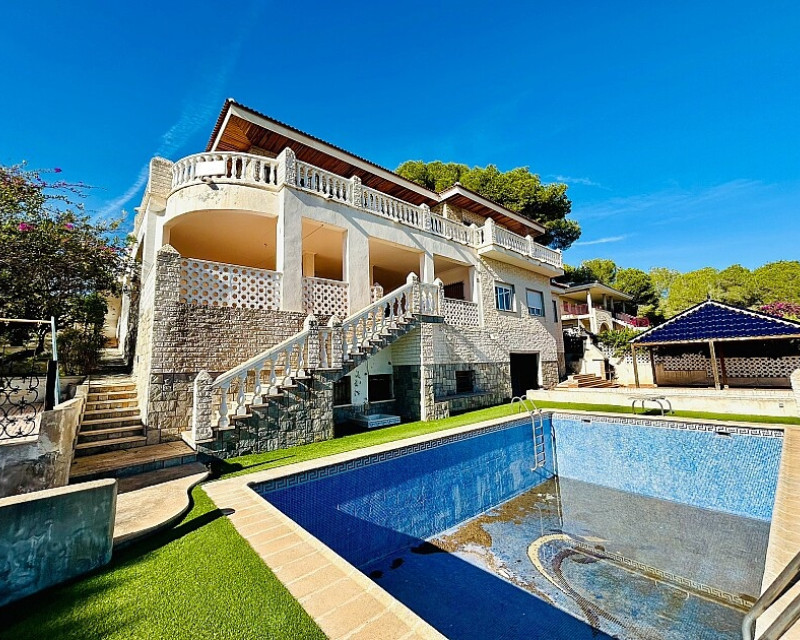 Detached villa in Dehesa de Campoamor. Detached villa with large garden, garage and private pool just a few metres from the beach of Dehesa de Campoamor. The house has 800 m2 built on 3 levels. On the ground floor there are 8 bedrooms, 7 bathrooms, a spacious living room with open kitchen, fireplace and a large terrace. On the ground floor there are another 2 bedrooms, 2 bathrooms, a spacious living room with kitchen and a covered terrace. In the basement there is a large garage for 2-3 cars and additional spaces where more bedrooms, a wine cellar, sauna, gym or similar can be made. The house is built on a plot of 1020 m2, with a large swimming pool, garden, gazebo and barbecue area. The house is ideal for living all year round or for renting. It is the ideal investment to open a mini-hotel with 8-10 rooms. It enjoys an ideal location on a hillside with panoramic views of the sea and the original coniferous forest of the Dehesa de Campoamor.