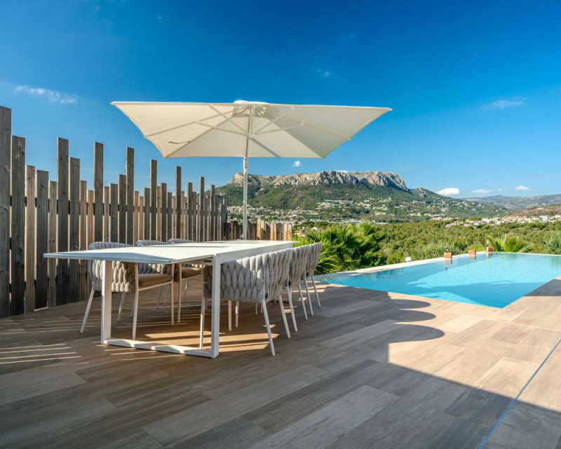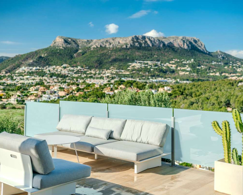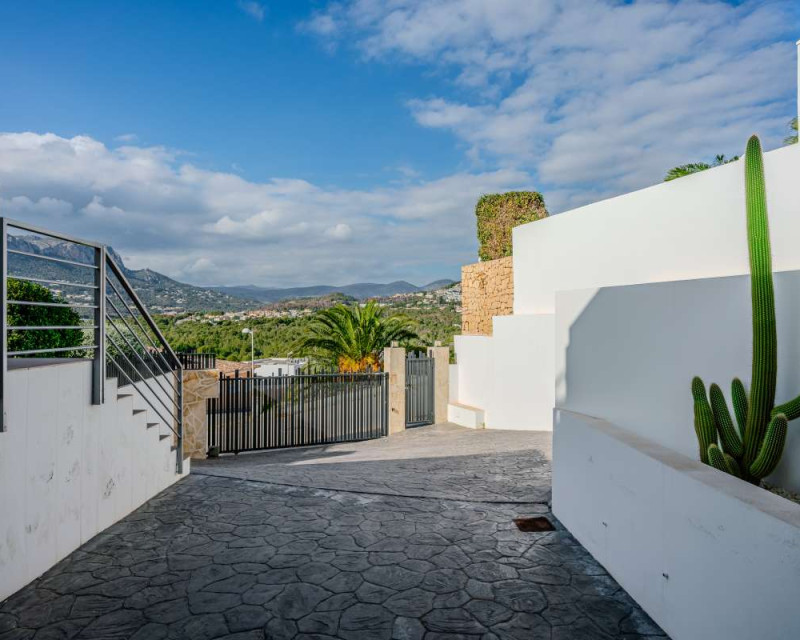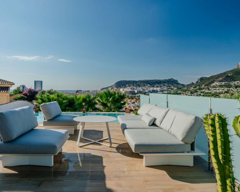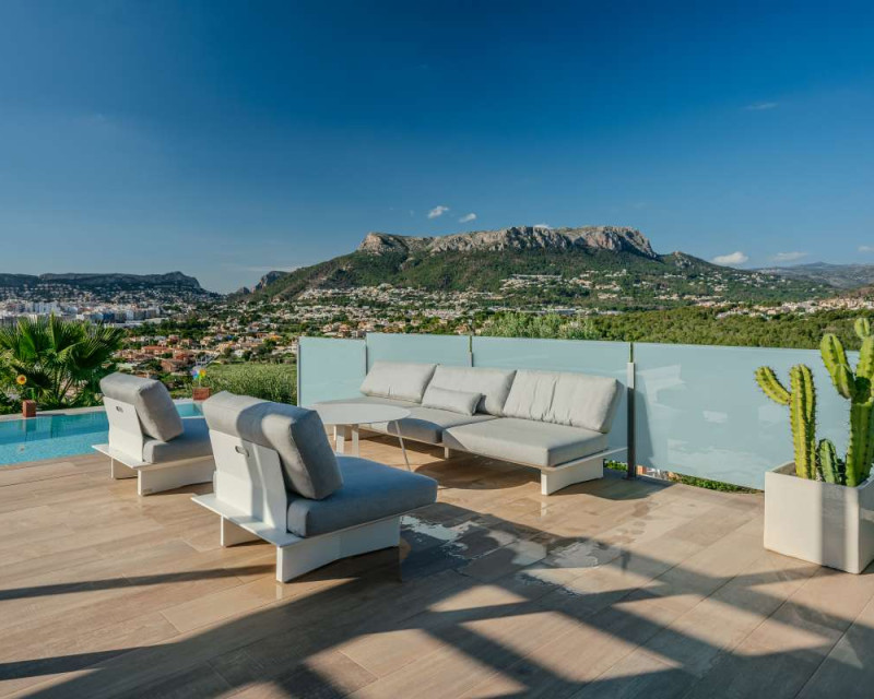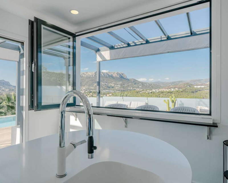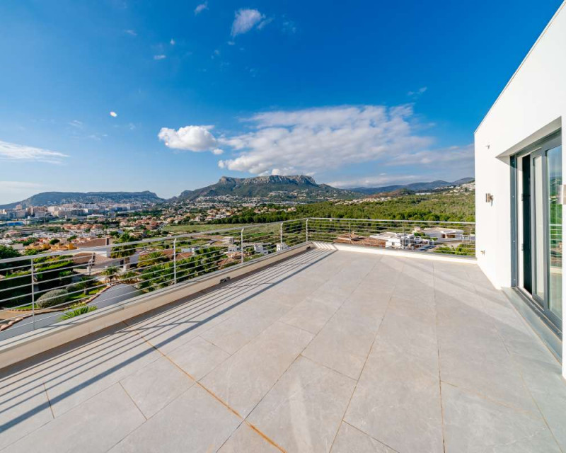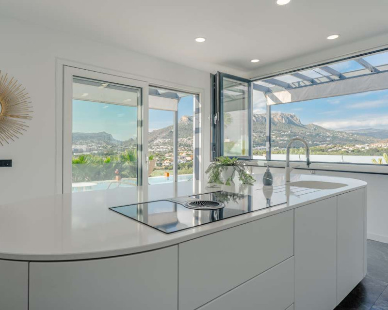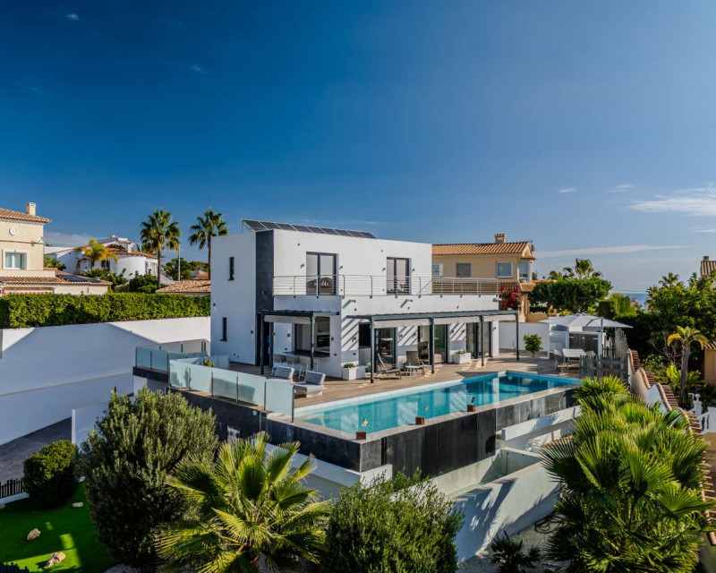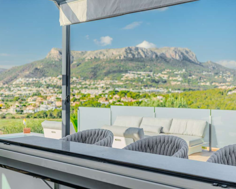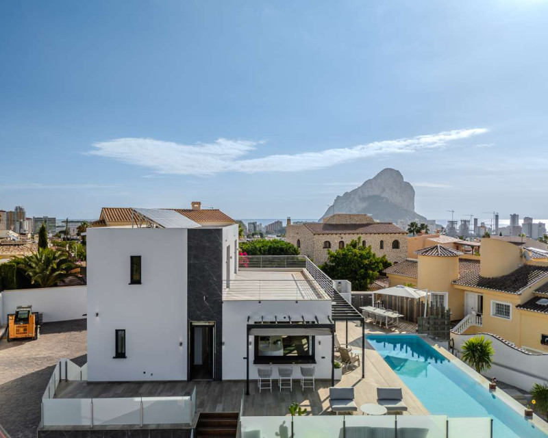 CALPE | MODERN VILLA WIITH PANORAMIC VIEWS br>br> Modern bioclimatic villa for sale in Calpe, in the Casanova urbanization, situated just 1 Km from the town centre of Calpe, from the most incredible beaches and from all services. This new built modern design villa enjoys very good panoramic views to the sea (and to the Peñón de Ifach, symbol of the Costa Blanca) and sun all day (South orientation). It is Located on a 900 m2 plot and has a living area of 204 m2 distributed over 2 floors + basement as follows: entrance hall + corridor of 10 m2 (perfectly equipped with built in wardrobes), 2 large bedrooms (12 m2 + 12 m2), each with built in wardrobes and en suite shower room, 1 guest toilet, magnificent open plan kitchen dining living room (all connected, with island, in total 50 m2) that communicates with a large exterior terrace (+100 m2), where we find a fabulous 42 m2 rectangular pool with endless effect, a beautiful outdoor shower and a handy chill out area located next to the kitchen area. The upper floor is accessed through an internal staircase. On the upper floor we have 2 large bedrooms (12 m2 + 12 m2), both with built in wardrobes and bathroom en suite, and a magnificent private terrace of 60 m2. In the basement (independent access), we have an giant garage (multipurpose area) of 142 m2 that offers a multitude of development possibilities to this property. In addition, it has a 6 m2 technical room and a 20 m2 storage room. We are facing a new and avantgarde construction concept, which has an insulation that complies with future regulations, highlighting for example its PVC windows with triple glazing. Therefore, this property has a very low energy consumption and maintains a constant ambient temperature of 22 degrees. There is even an installation of photovoltaic solar panels that reduce electricity consumption to a minimum. It is equipped with with air conditioning in the living room and master bedroom, 100% equipped designer kitchen (Bosch), high end exterior carpentry with safety glass, automatic shutters, designer bathrooms, LED lighting, glass railings, alarm… In addition, it enjoys large exterior parking areas for several vehicles. Here we have the opportunity to own one of the few truly bioclimatic properties existing on this beautiful Mediterranean coast, which also offers an excellent location and beautiful panoramic views of the sea and of the mountains.br>br> VIDEOS: https://vimeo.com/1034489730 https://vimeo.com/1034489563