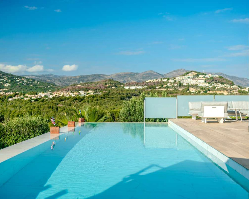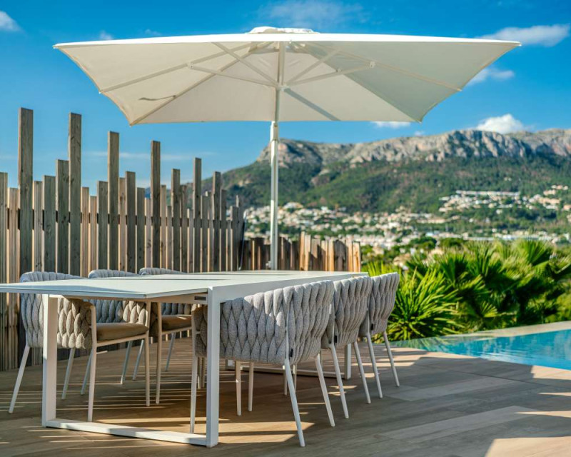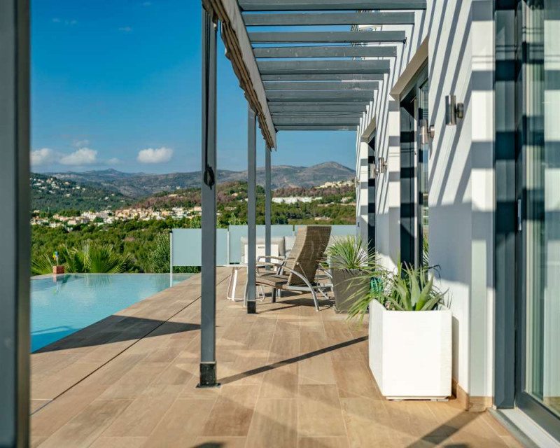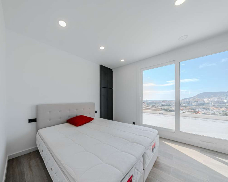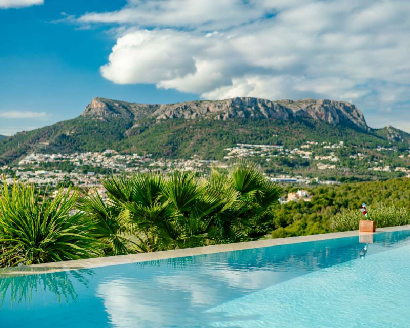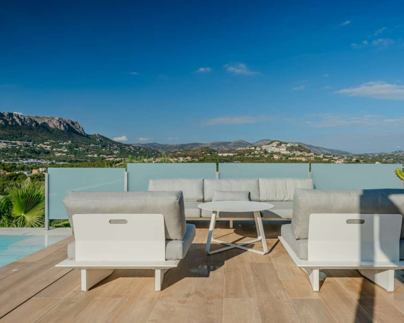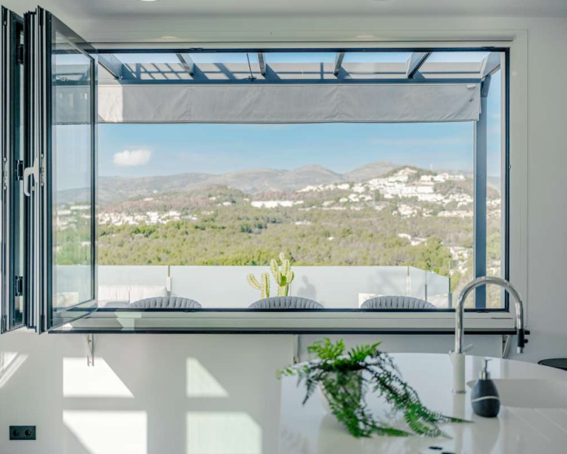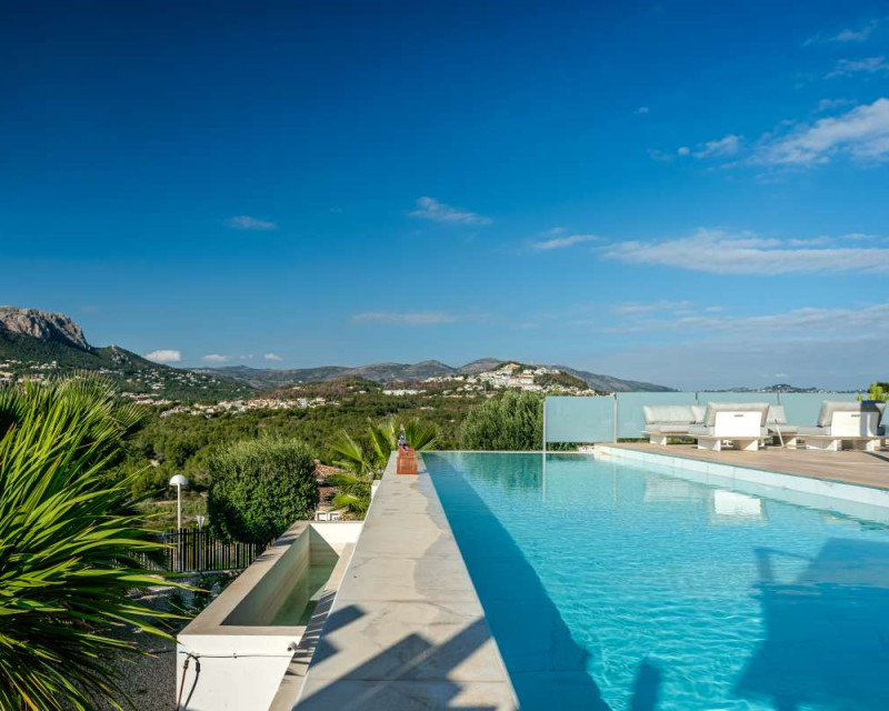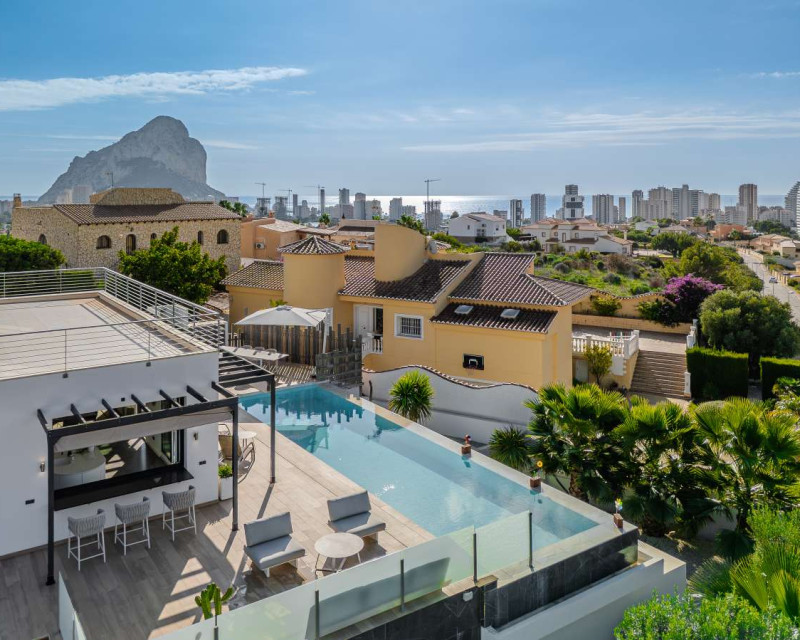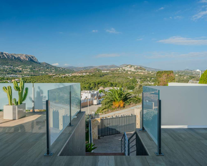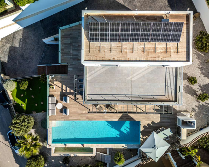 CALPE | MODERN VILLA WIITH PANORAMIC VIEWS br>br> Modern bioclimatic villa for sale in Calpe, in the Casanova urbanization, situated just 1 Km from the town centre of Calpe, from the most incredible beaches and from all services. This new built modern design villa enjoys very good panoramic views to the sea (and to the Peñón de Ifach, symbol of the Costa Blanca) and sun all day (South orientation). It is Located on a 900 m2 plot and has a living area of 204 m2 distributed over 2 floors + basement as follows: entrance hall + corridor of 10 m2 (perfectly equipped with built in wardrobes), 2 large bedrooms (12 m2 + 12 m2), each with built in wardrobes and en suite shower room, 1 guest toilet, magnificent open plan kitchen dining living room (all connected, with island, in total 50 m2) that communicates with a large exterior terrace (+100 m2), where we find a fabulous 42 m2 rectangular pool with endless effect, a beautiful outdoor shower and a handy chill out area located next to the kitchen area. The upper floor is accessed through an internal staircase. On the upper floor we have 2 large bedrooms (12 m2 + 12 m2), both with built in wardrobes and bathroom en suite, and a magnificent private terrace of 60 m2. In the basement (independent access), we have an giant garage (multipurpose area) of 142 m2 that offers a multitude of development possibilities to this property. In addition, it has a 6 m2 technical room and a 20 m2 storage room. We are facing a new and avantgarde construction concept, which has an insulation that complies with future regulations, highlighting for example its PVC windows with triple glazing. Therefore, this property has a very low energy consumption and maintains a constant ambient temperature of 22 degrees. There is even an installation of photovoltaic solar panels that reduce electricity consumption to a minimum. It is equipped with with air conditioning in the living room and master bedroom, 100% equipped designer kitchen (Bosch), high end exterior carpentry with safety glass, automatic shutters, designer bathrooms, LED lighting, glass railings, alarm… In addition, it enjoys large exterior parking areas for several vehicles. Here we have the opportunity to own one of the few truly bioclimatic properties existing on this beautiful Mediterranean coast, which also offers an excellent location and beautiful panoramic views of the sea and of the mountains.br>br> VIDEOS: https://vimeo.com/1034489730 https://vimeo.com/1034489563