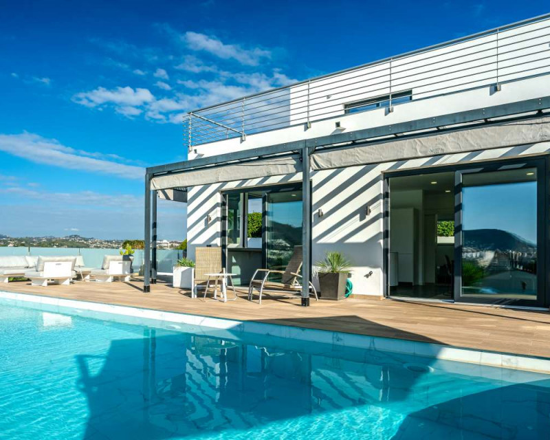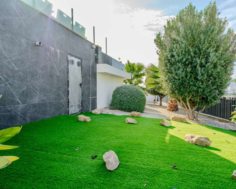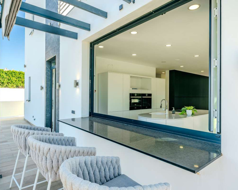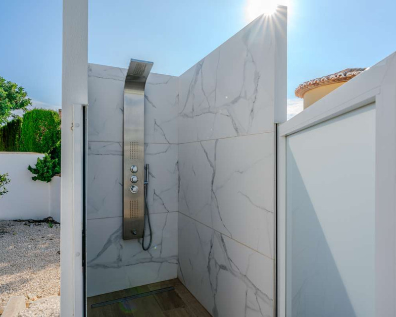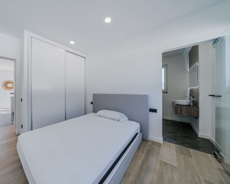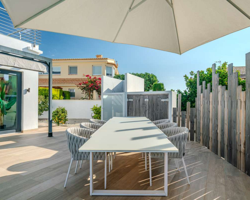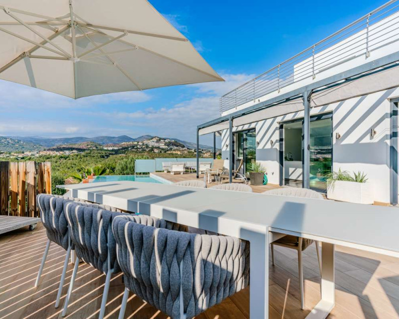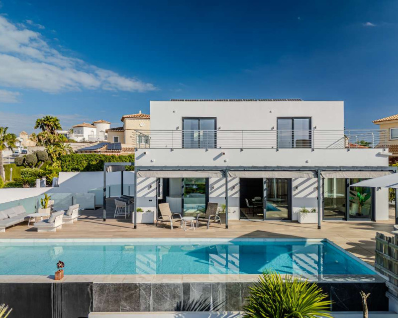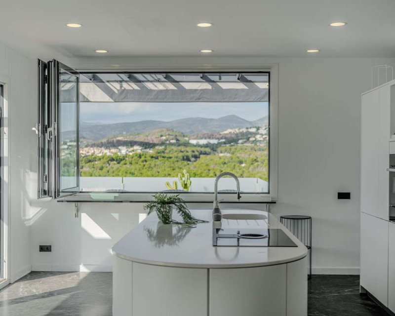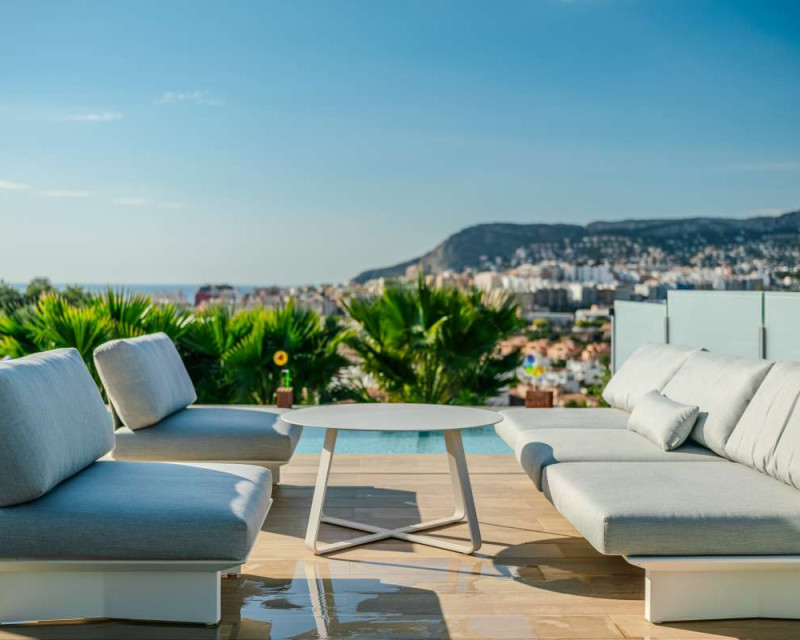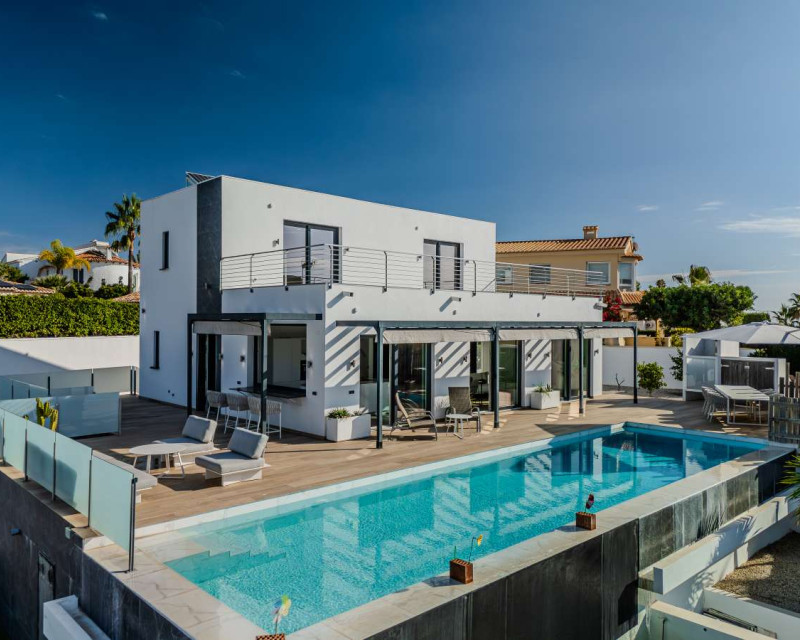CALPE | MODERN VILLA WIITH PANORAMIC VIEWS br>br> Modern bioclimatic villa for sale in Calpe, in the Casanova urbanization, situated just 1 Km from the town centre of Calpe, from the most incredible beaches and from all services. This new built modern design villa enjoys very good panoramic views to the sea (and to the Peñón de Ifach, symbol of the Costa Blanca) and sun all day (South orientation). It is Located on a 900 m2 plot and has a living area of 204 m2 distributed over 2 floors + basement as follows: entrance hall + corridor of 10 m2 (perfectly equipped with built in wardrobes), 2 large bedrooms (12 m2 + 12 m2), each with built in wardrobes and en suite shower room, 1 guest toilet, magnificent open plan kitchen dining living room (all connected, with island, in total 50 m2) that communicates with a large exterior terrace (+100 m2), where we find a fabulous 42 m2 rectangular pool with endless effect, a beautiful outdoor shower and a handy chill out area located next to the kitchen area. The upper floor is accessed through an internal staircase. On the upper floor we have 2 large bedrooms (12 m2 + 12 m2), both with built in wardrobes and bathroom en suite, and a magnificent private terrace of 60 m2. In the basement (independent access), we have an giant garage (multipurpose area) of 142 m2 that offers a multitude of development possibilities to this property. In addition, it has a 6 m2 technical room and a 20 m2 storage room. We are facing a new and avantgarde construction concept, which has an insulation that complies with future regulations, highlighting for example its PVC windows with triple glazing. Therefore, this property has a very low energy consumption and maintains a constant ambient temperature of 22 degrees. There is even an installation of photovoltaic solar panels that reduce electricity consumption to a minimum. It is equipped with with air conditioning in the living room and master bedroom, 100% equipped designer kitchen (Bosch), high end exterior carpentry with safety glass, automatic shutters, designer bathrooms, LED lighting, glass railings, alarm… In addition, it enjoys large exterior parking areas for several vehicles. Here we have the opportunity to own one of the few truly bioclimatic properties existing on this beautiful Mediterranean coast, which also offers an excellent location and beautiful panoramic views of the sea and of the mountains.br>br> VIDEOS: https://vimeo.com/1034489730 https://vimeo.com/1034489563