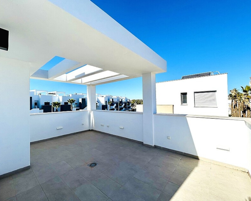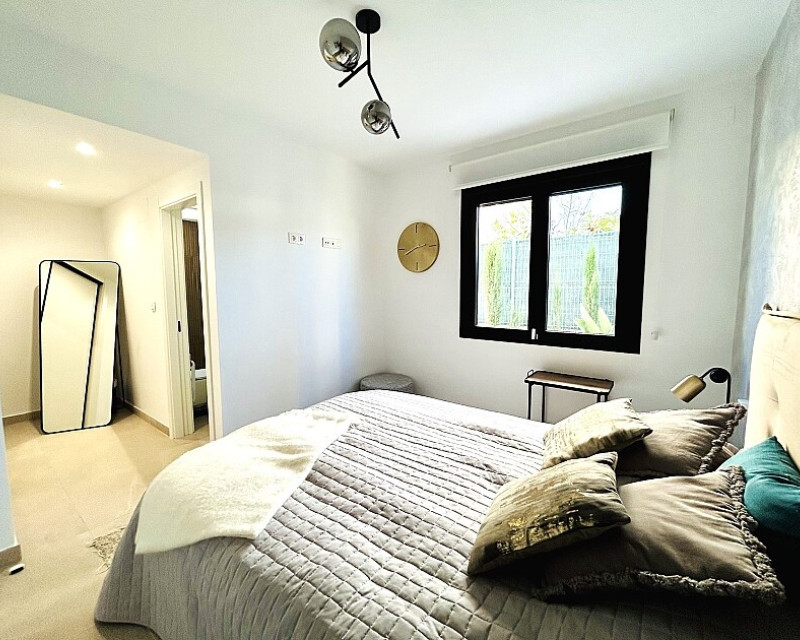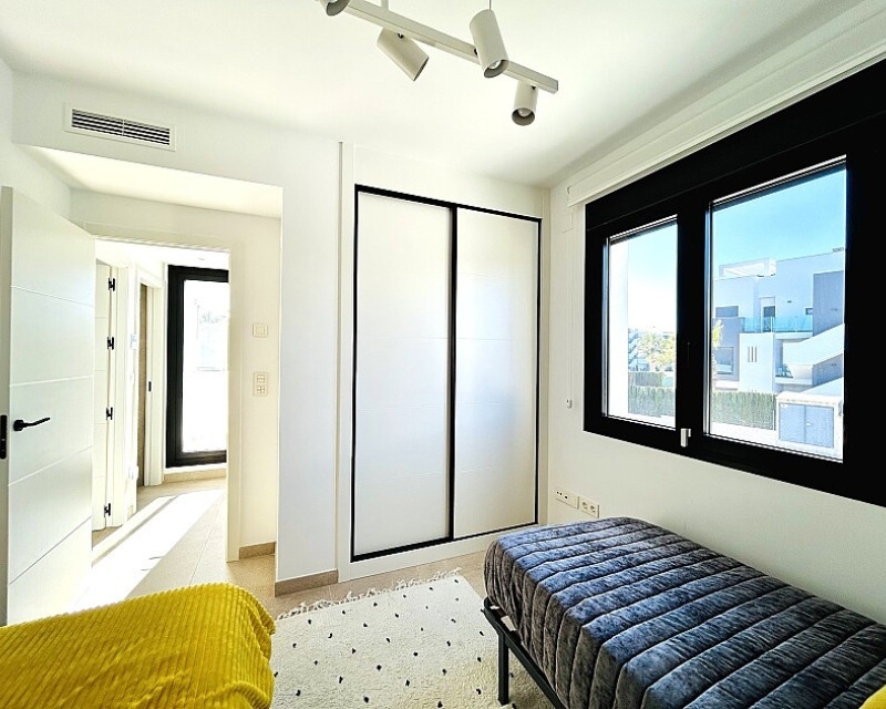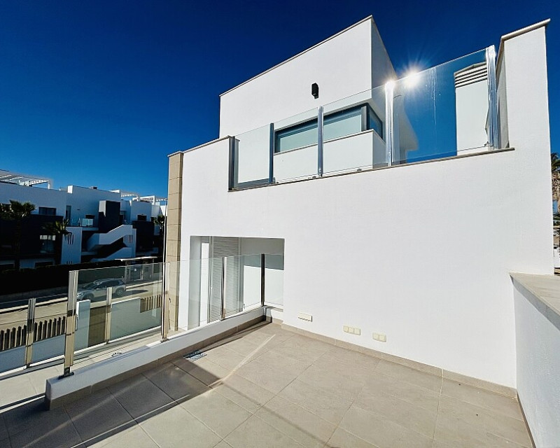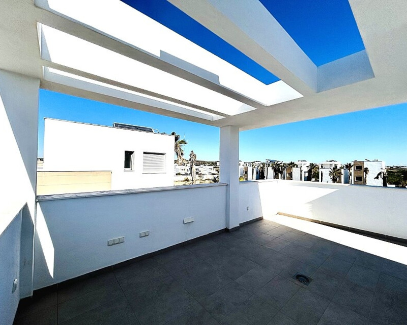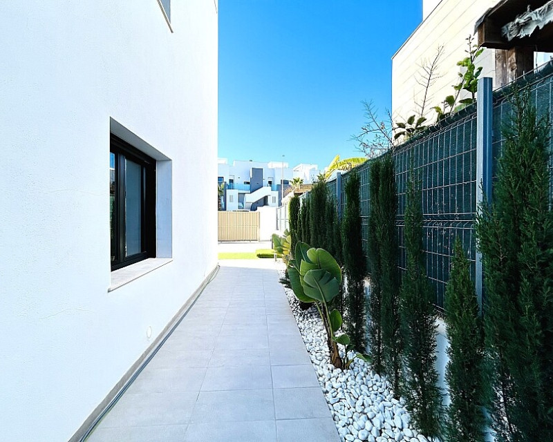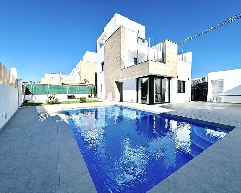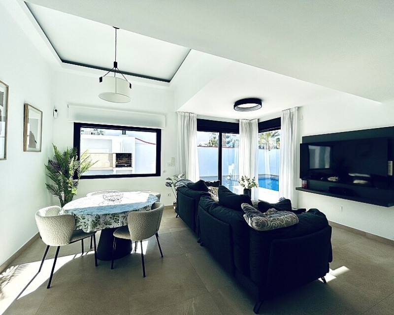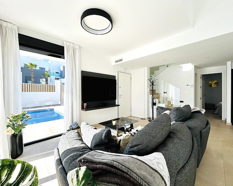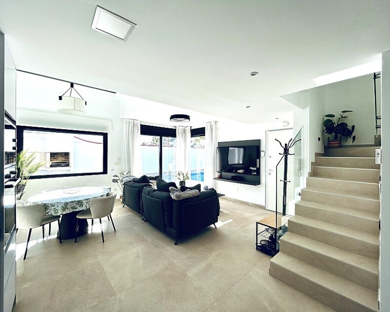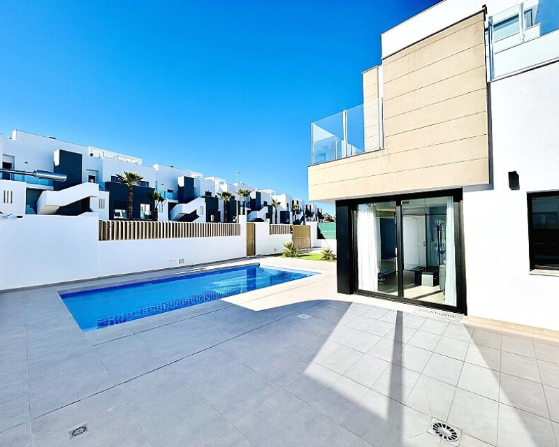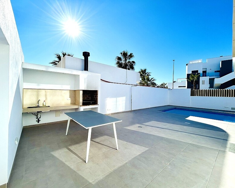 3 bedroom detached villa with pool in Guardamar del Segura with garden and pool in Guardamar del Segura . Detached two-storey villa with private plot in El Raso, 10 minutes drive to La Mata beach and Guardamar del Segura. The ground floor consists of a living room, kitchen, toilet, a bedroom with dressing room and bathroom . On the first floor , which is accessed by the internal staircase from the ground floor, there are two bedrooms, a bathroom and access to a porch, terrace and solarium with pergola. It is in very good condition, has air conditioning, electric blinds, underfloor heating in the bathrooms, built-in wardrobes, and is sold with furniture and appliances. You can also enjoy a private pool, garden, parking and summer kitchen.