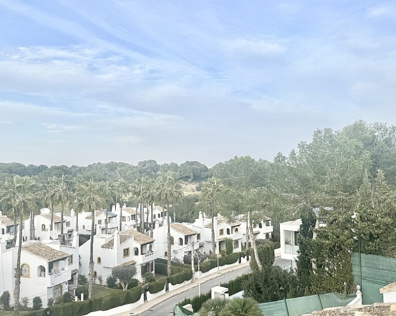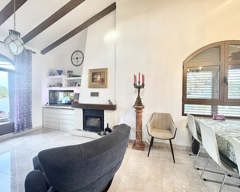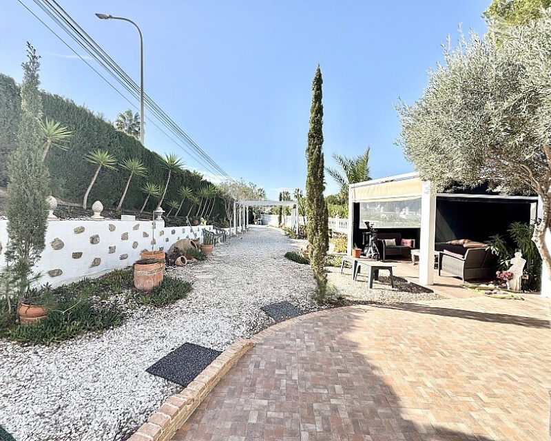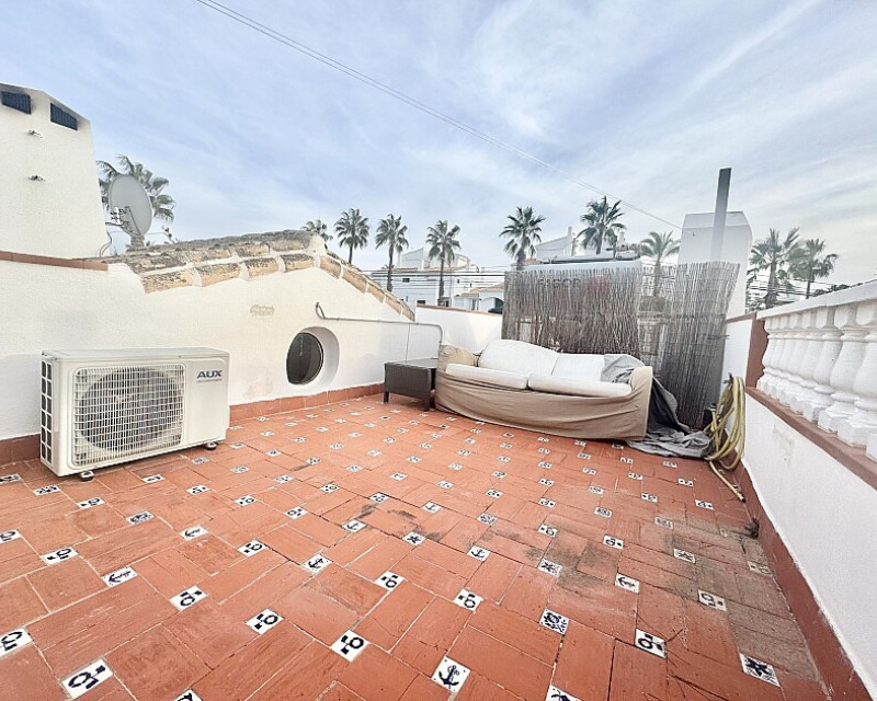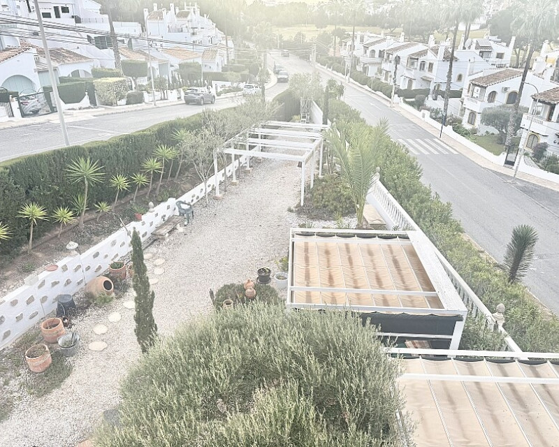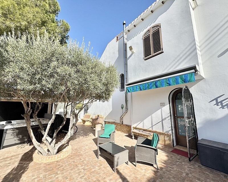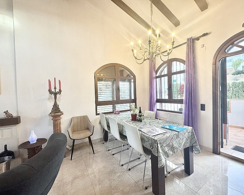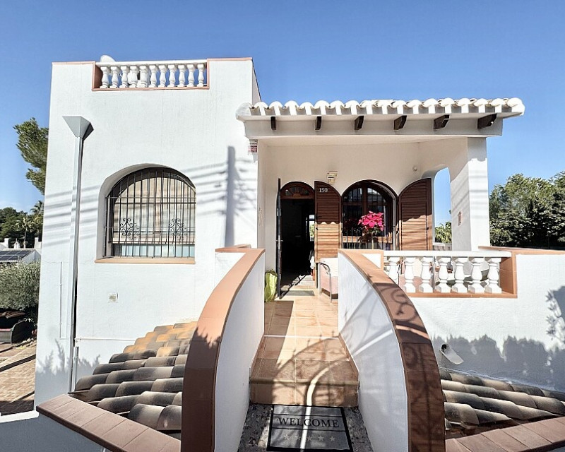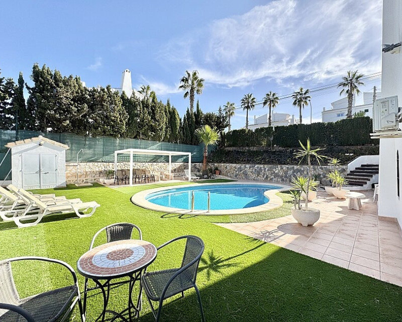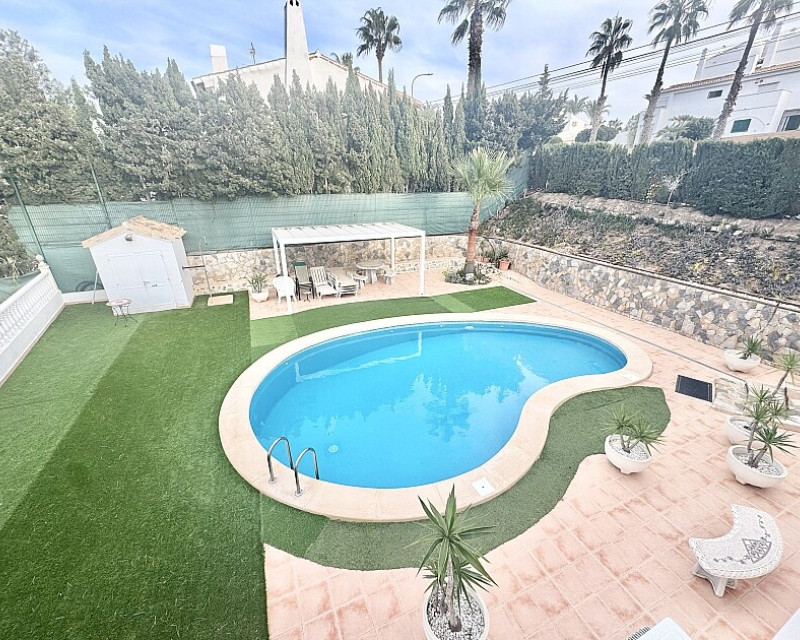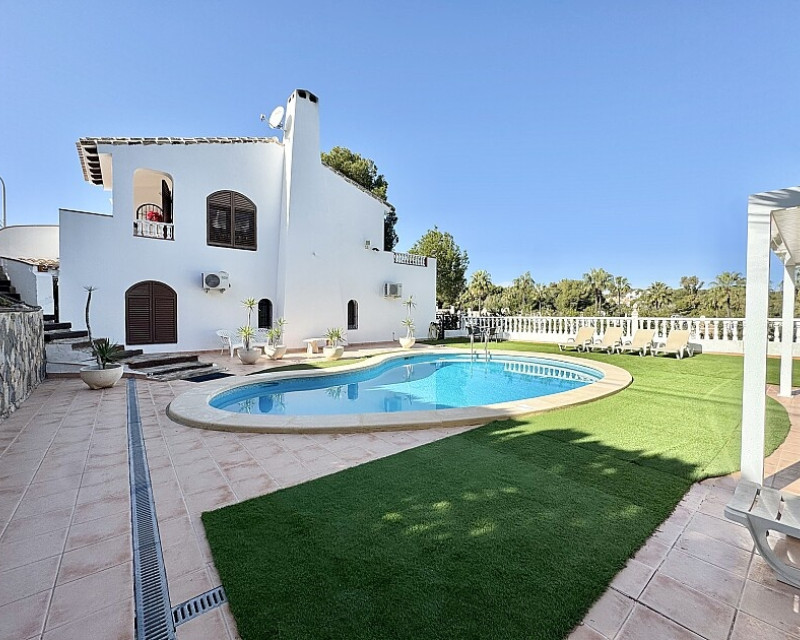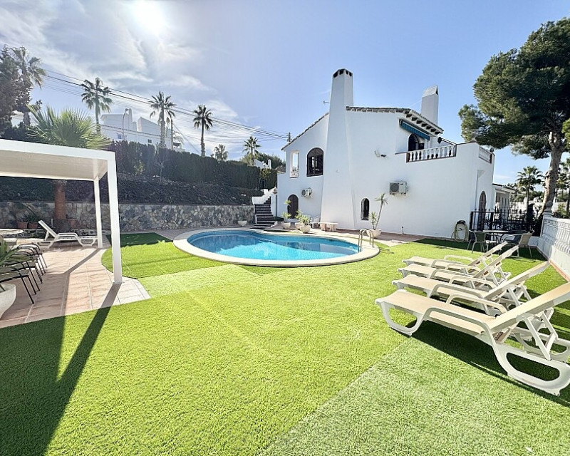 4 bedroom detached villa with views to Villamartin golf course. Detached villa with 4 bedrooms and 2 bathrooms and private pool. This south-facing villa with views of the Villamartin golf course enjoys a large 900 m2 plot, private pool, jacuzzi and solarium. Sold fully furnished and equipped, recently renovated and with a fireplace on each floor and air conditioning. This chalet has a tourist license, therefore it is a great opportunity either for investment or to live all year round. It is located 20 minutes walk from the square and the golf course of Villamartín and a few minutes drive from the beaches of Orihuela Costa.