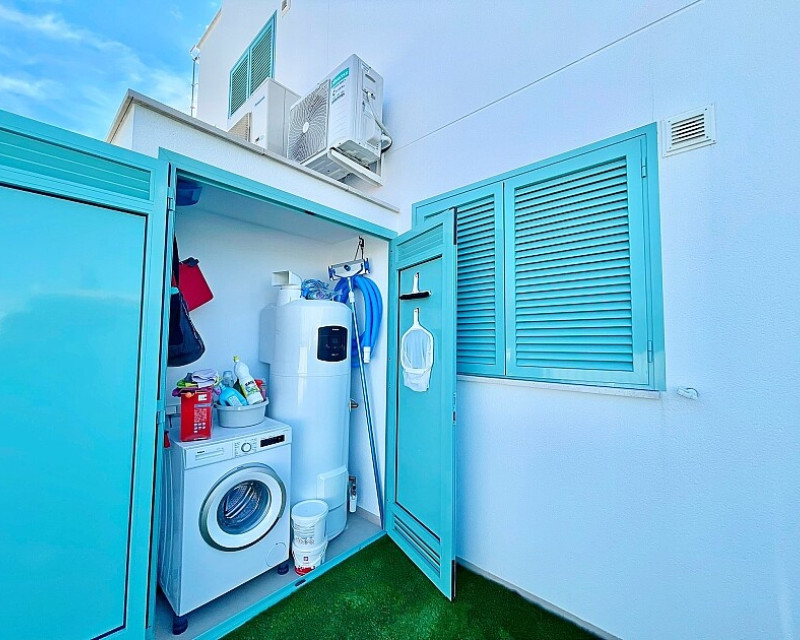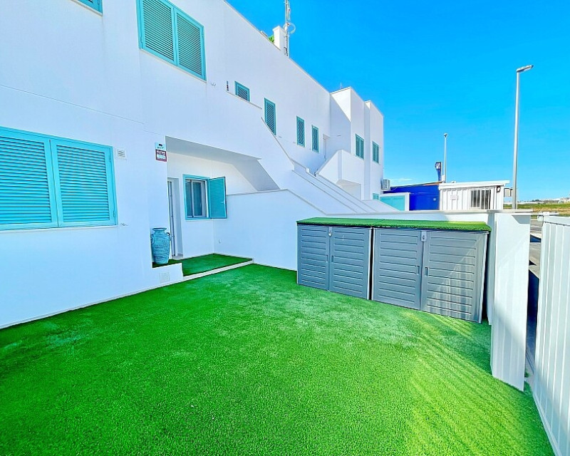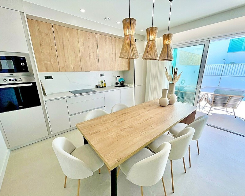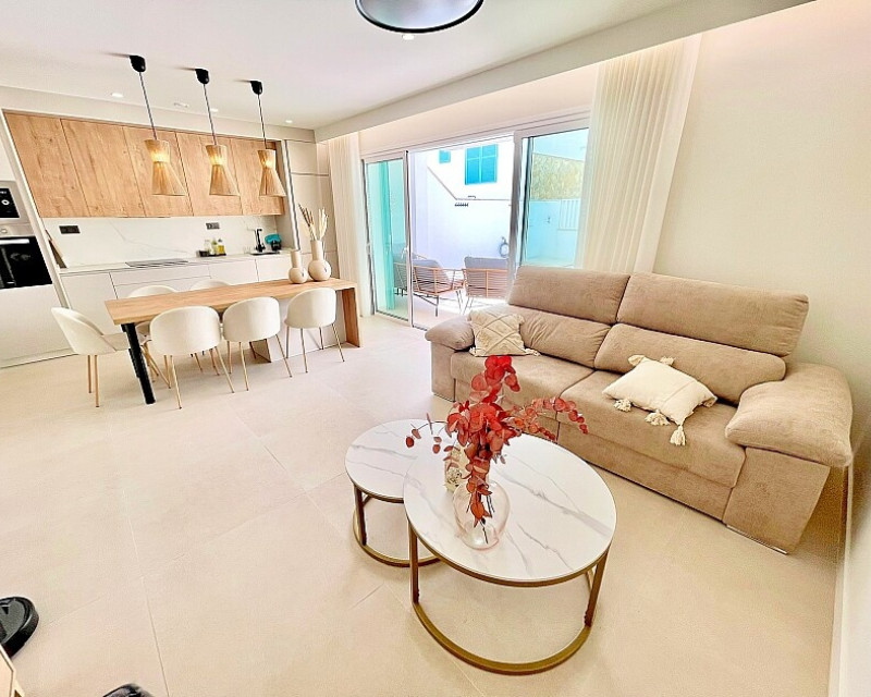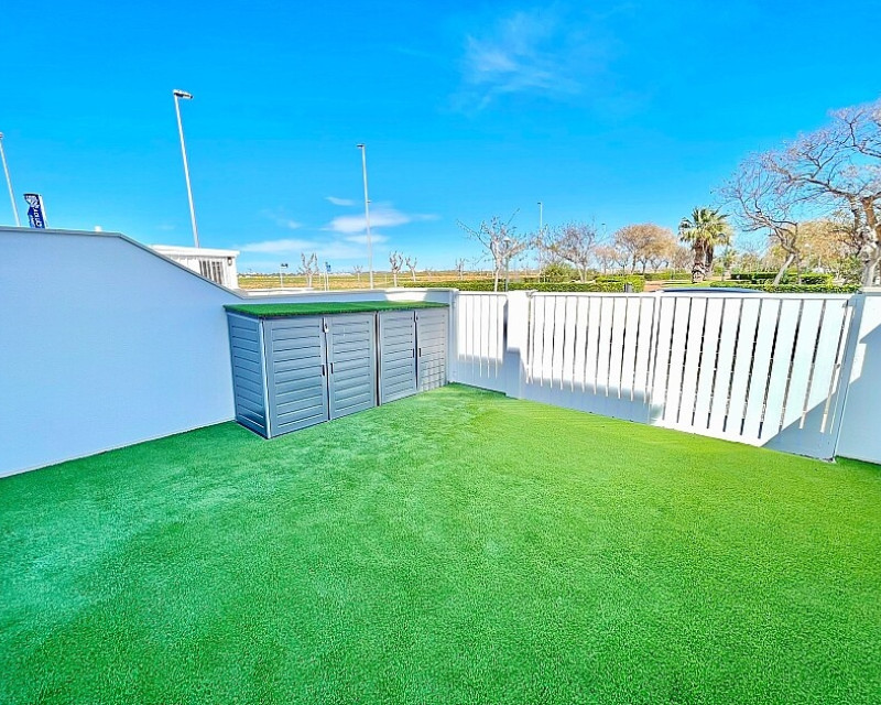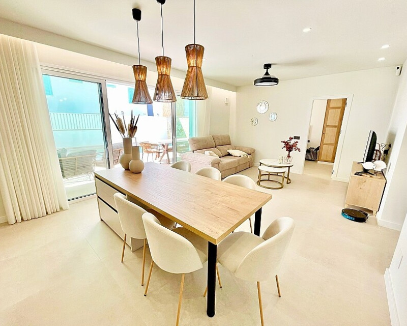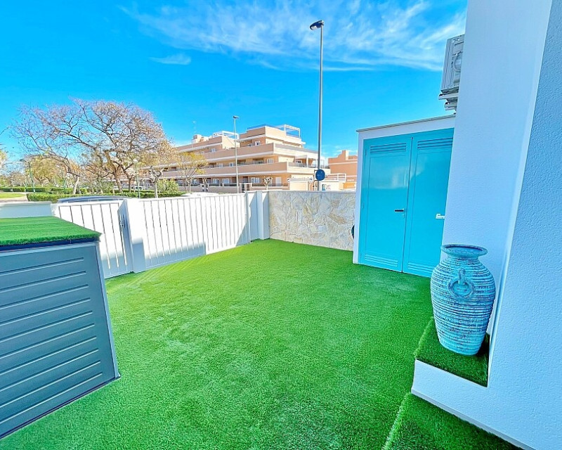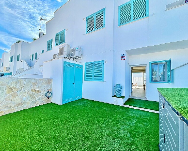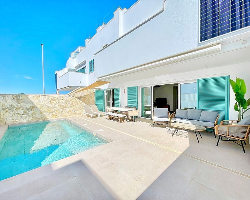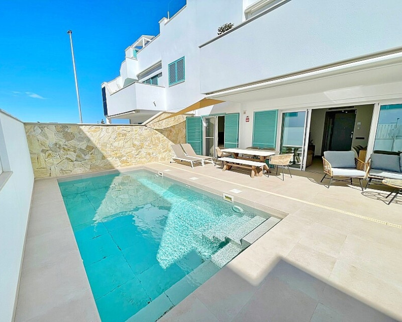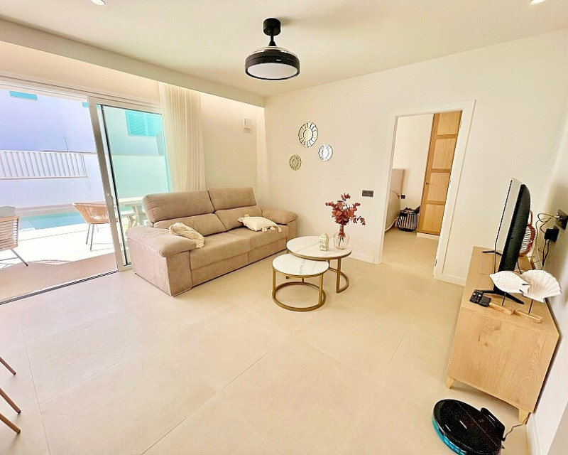 3 bedroom ground floor bungalow 400 m. walk to the beach in Torre de la Horadada. Ground floor bungalow with 3 bedrooms and 2 bathrooms on Las Higuericas beach in Torre de la Horadada. This spacious and bright bungalow offers a living-dining room with an open kitchen, large bedrooms, one of which is a suite, and direct access to the private pool. It also offers a car entrance in the private garden. The home is sold furnished, with a fully equipped kitchen, underfloor heating, air conditioning, large terraces, and a private pool. Just 400 meters away are Higuericas Beach and El Pilar de la Horadada. The bars and restaurants are a 1-minute walk away. The distance to Alicante Airport is 60 kilometers, and to Corvera-Murcia Airport, 50 kilometers.