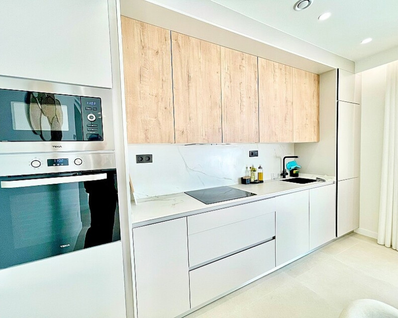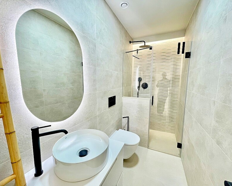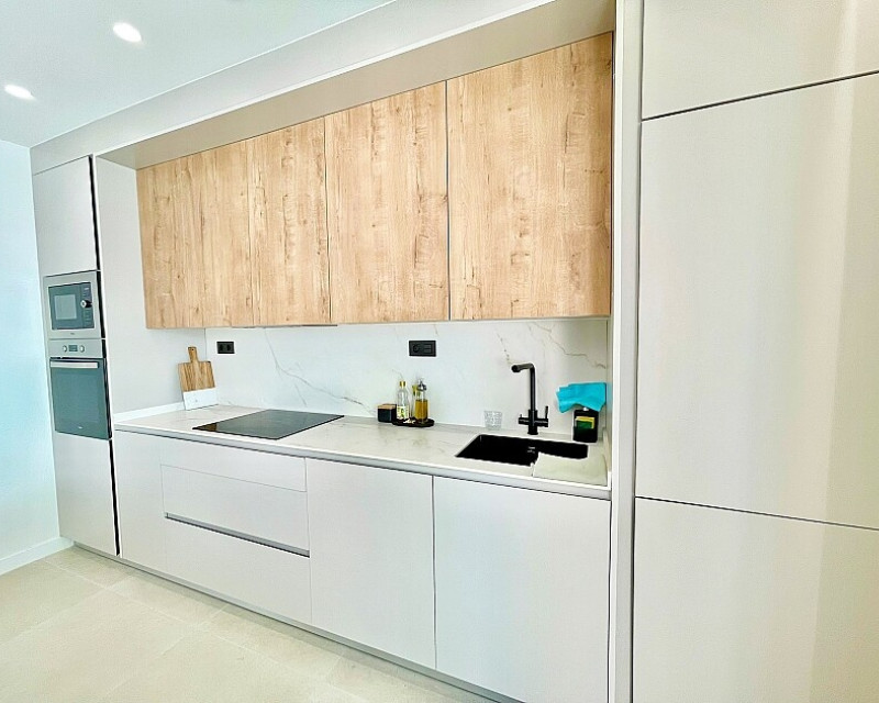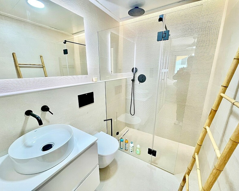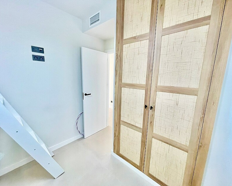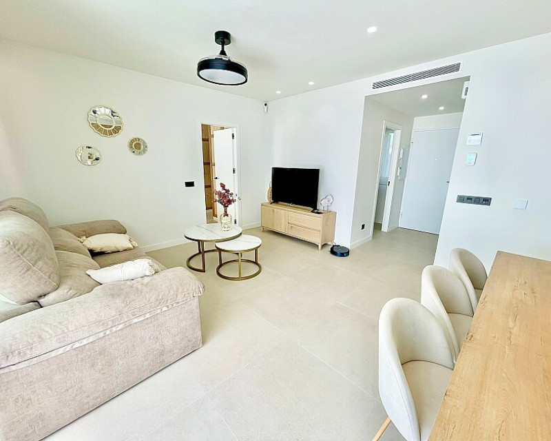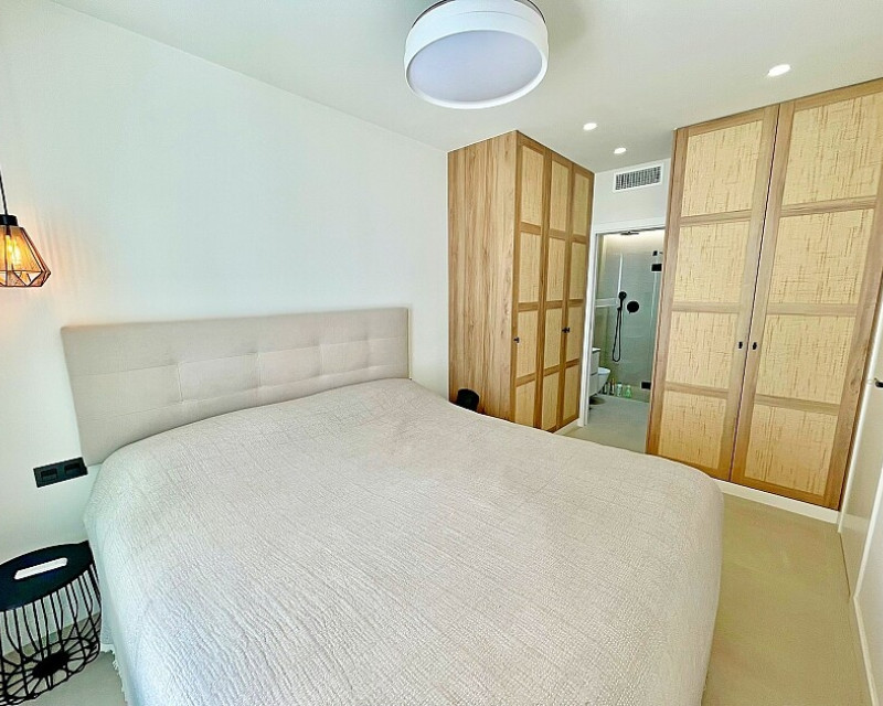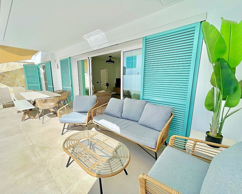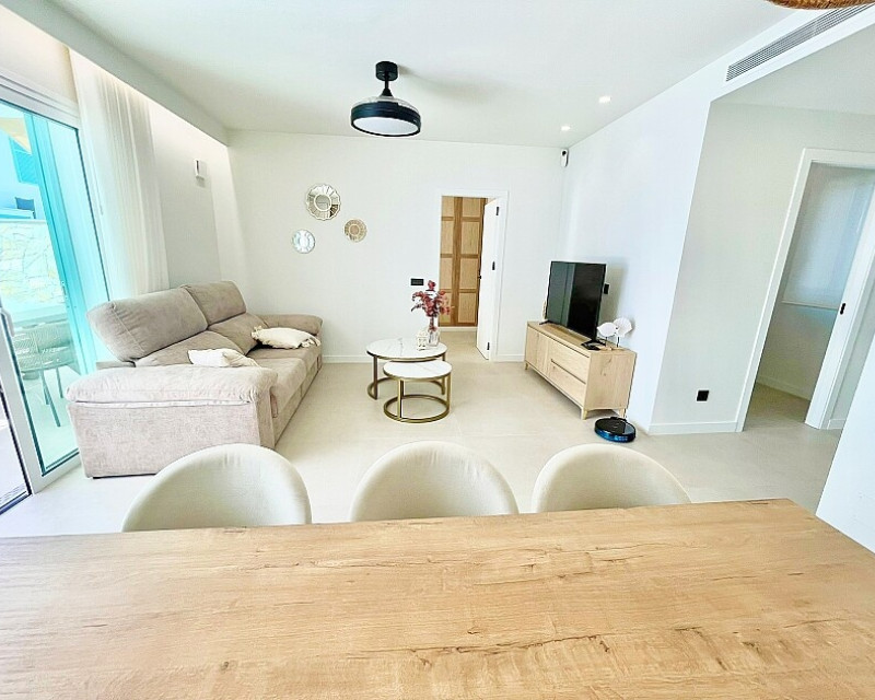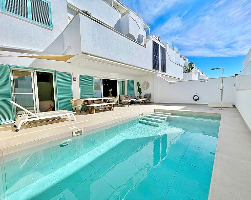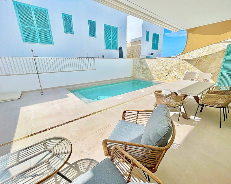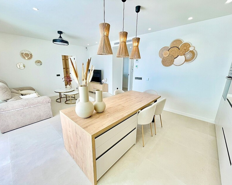 3 bedroom ground floor bungalow 400 m. walk to the beach in Torre de la Horadada. Ground floor bungalow with 3 bedrooms and 2 bathrooms on Las Higuericas beach in Torre de la Horadada. This spacious and bright bungalow offers a living-dining room with an open kitchen, large bedrooms, one of which is a suite, and direct access to the private pool. It also offers a car entrance in the private garden. The home is sold furnished, with a fully equipped kitchen, underfloor heating, air conditioning, large terraces, and a private pool. Just 400 meters away are Higuericas Beach and El Pilar de la Horadada. The bars and restaurants are a 1-minute walk away. The distance to Alicante Airport is 60 kilometers, and to Corvera-Murcia Airport, 50 kilometers.