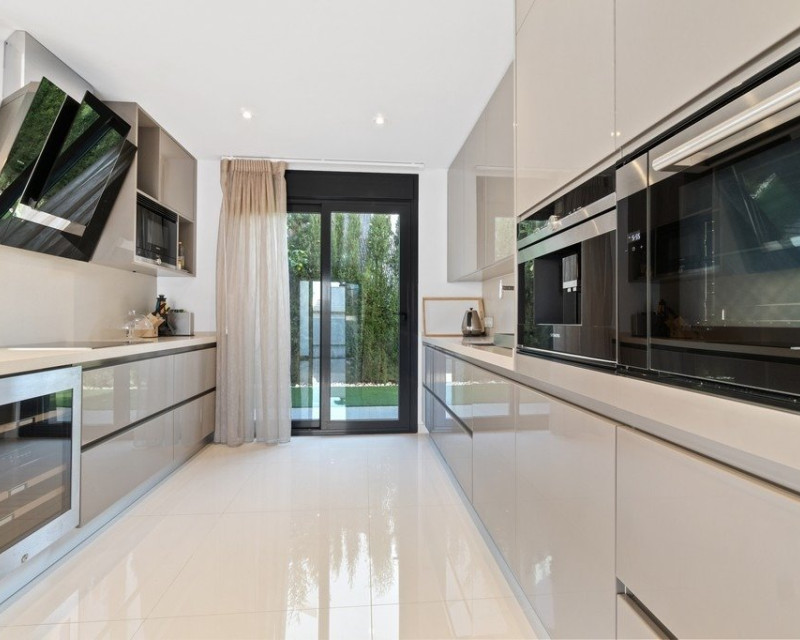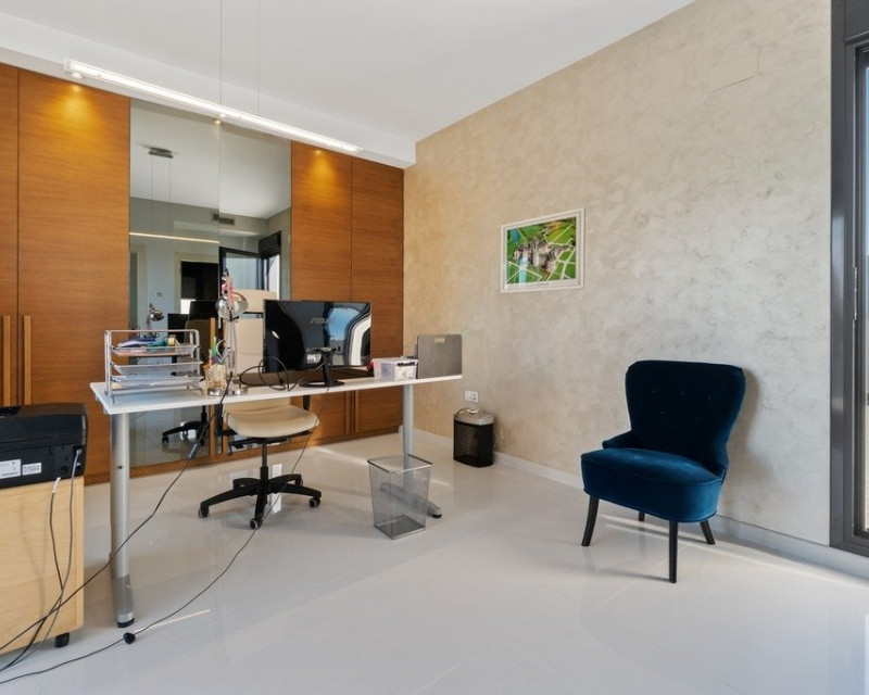 Modern style luxury villa located in Campoamor, only 300 m from the beach. Villa with an area of 200m2, built on a plot of 500m2, the house has 4 bedrooms, 3 bathrooms, living room, kitchen, terrace and solarium of 46m2 with sea views. The outside part has a private pool 8x4. Underfloor heating in the bathrooms, centralized air conditioning installed, parking on the plot. Top quality materials. Heated saltwater pool. It is close to all services, schools, just 10 minutes by car from the largest shopping center in Alicante, Zenia Boulevard, 40 minutes from Alicante airport and a few minutes from some of the best golf courses.