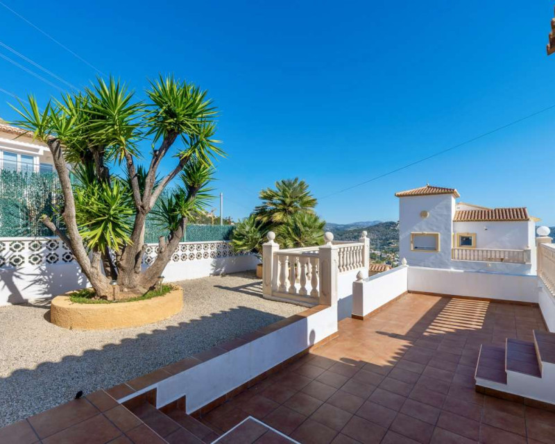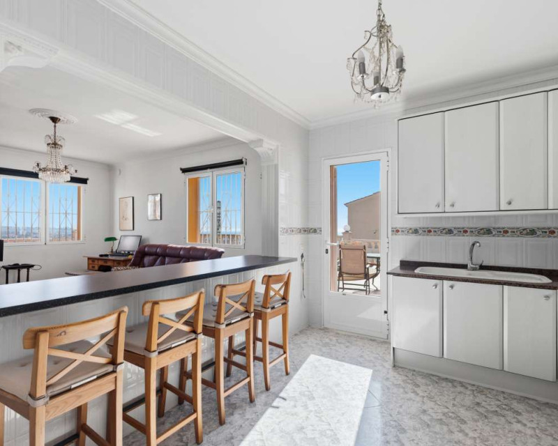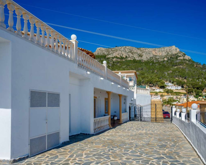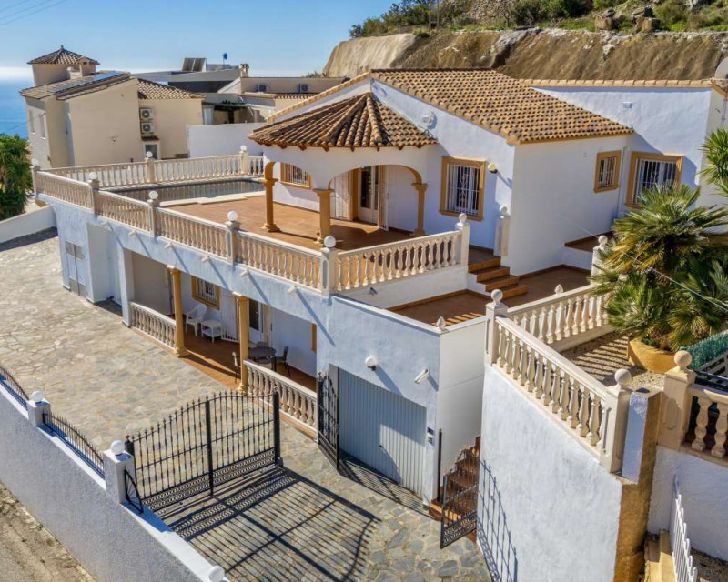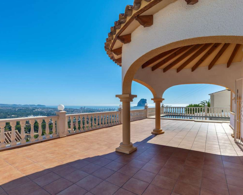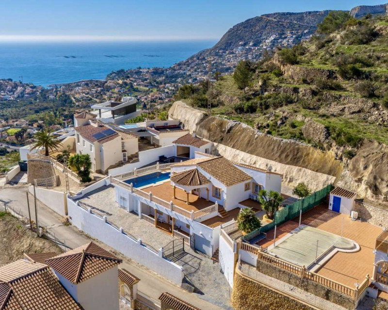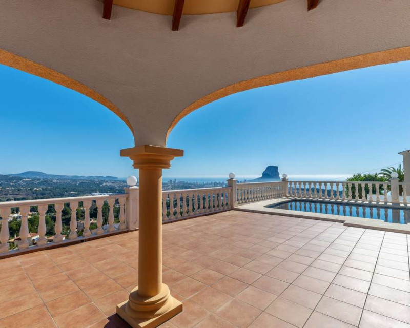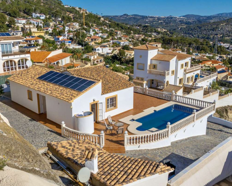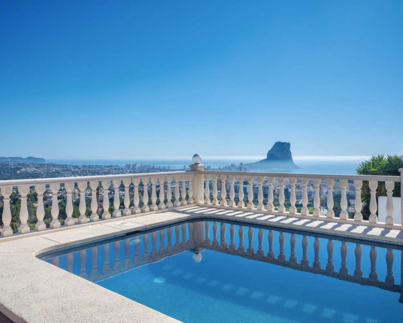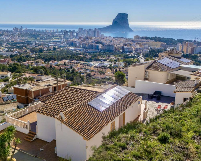 Built in 2004 on a 799 m² plot, this 248 m² villa is located in a peaceful elevated residential area of Calpe, where the Mediterranean Sea, the mountains, the iconic Peñón de Ifach and the town unfold in front of you like a living postcard. By day you wake up to endless blue; by night you enjoy the magic of Calpe’s sparkling lights below.The property is distributed over two independent floors, making it ideal for permanent living, hosting guests, or combining private use with rental potential.On the first floor, an entrance hall leads to two spacious bedrooms, each with its own en-suite bathroom, creating a private and comfortable retreat for family members or visitors.The second floor opens into a bright open-plan kitchen connected seamlessly to the living room, forming the heart of the home — a space filled with light and views. This level also includes one additional bedroom, a separate bathroom, and a master bedroom with its own en-suite. Every window frames the sea, the mountains and the Peñón, turning daily life into something quietly extraordinary.Outside, Mediterranean living takes center stage with a private swimming pool, a summer kitchen perfect for sunset dinners, a low-maintenance garden and a private garage. The house is equipped with solar panels, a water boiler and a gas heating system, ensuring comfort and efficiency throughout the year.The location offers privacy without isolation. The town centre is approximately 5–7 minutes by car, beaches around 7–10 minutes, restaurants and bars within 5–8 minutes, the nautical club and marina about 10 minutes, golf courses approximately 15–20 minutes, and international schools around 15–25 minutes away.This villa is perfectly suited both as a permanent residence — thanks to its space, heating system and practical layout — and as a holiday home where every stay feels elevated above the ordinary.It is not just a property with views. It is a home that lives with the sky and the sea.